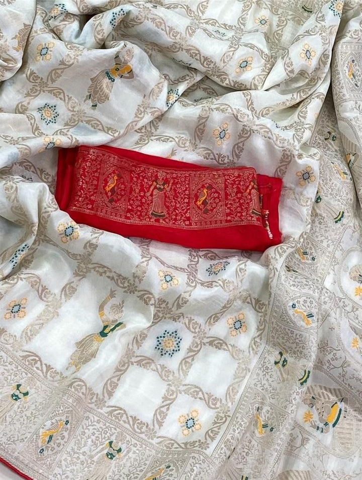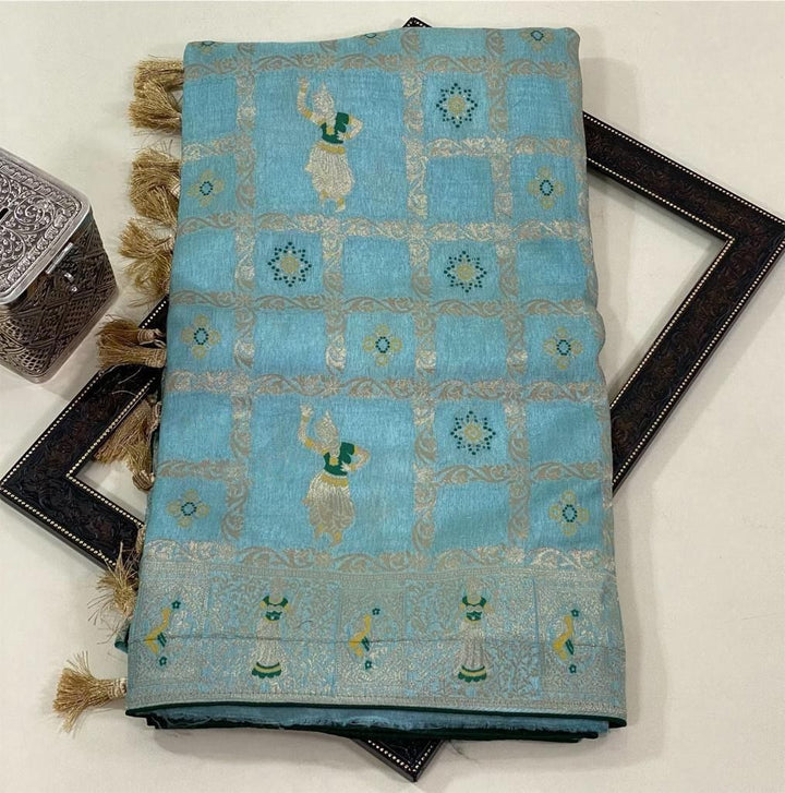 Pure Dhola Silk Weaving Saree With Rich Zari Wooven Pallu With Fancy Taseels And Rich Zari Wooven Border With Meenakari Jaal Weaving In Full Saree Pairs With Contrast Piping Lace In Full Saree With Butti Contrast Blouse